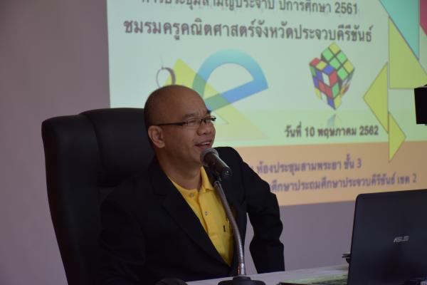 วันที่ 10 พฤษภาคม 2562 เวลา 09.00 น. นายบวร เทศารินทร์ ผู้อำนวยการสำนักงานเขตพื้นที่การศึกษาประถมศึกษาประจวบคีรีขันธ์ เขต 2 เป็นประธานในพิธีเปิดการประชุมสามัญประจำปี ปีการศึกษา 2561 ชมรมคณิตศาสตร์จังหวัดประจวบคีรีขันธ์ ณ ห้องประชุมสามพระยา ชั้น 3 สำนักงานเขตพื้นที่การศึกษาประถมศึกษาประจวบคีรีขันธ์ เขต 2
