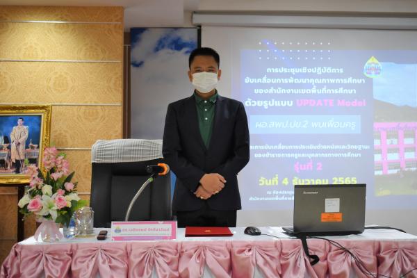 วันที่ 4 ธันวาคม 2565 เวลา 09.00 น. ดร.เฉลิมชนม์ รักลีลาวัฒน์ ผอ.สพป.ประจวบคีรีขันธ์ เขต 2 เป็นประธานเปิดการประชุมเชิงปฏิบัติการขับเคลื่อนการพัฒนาคุณภาพการศึกษาของสำนักงานเขตพื้นที่การศึกษาด้วยรูปแบบ UPDATE Model โดยมีนางสาวรุ่งกานต์ สืบสุทธา รอง ผอ.สพป.ประจวบคีรีขันธ์ เขต 2 พร้อมด้วย ผอ.กลุ่มทุกกลุ่ม หน่วยตรวจสอบภายใน เจ้าหน้าที่ที่เกี่ยวข้อง ครูและบุคลากรทางการศึกษาในสังกัด เข้าร่วมการประชุม ยังมีกิจกรรม "ผอ.สพป.ปข.2 พบเพื่อนครู" และการขับเคลื่อนการประเมินตำแหน่งและวิทยฐานะของข้าราชการครูและบุคลากรทางการศึกษา ในรุ่นที่ 2 โดยทีมวิทยากรผู้มีความรู้ที่ให้คำแนะนำ ณ ห้องประชุมสามพระยา (ชั้น 3) สำนักงานเขตพื้นที่การศึกษาประถมศึกษาประจวบคีรีขันธ์ เขต 2