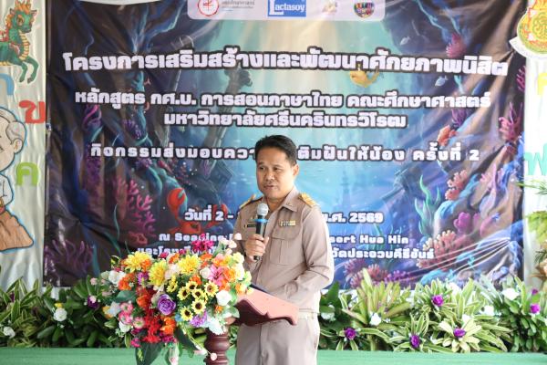 วันจันทร์ที่ 2 กุมภาพันธ์ 2569 นายทนงศักดิ์ คงเจริญสุข ผู้อำนวยการสำนักงานเขตพื้นที่การศึกษาประถมศึกษาประจวบคีรีขันธ์ เขต 2 เป็นประธานพิธีเปิด กิจกรรม "ส่งมอบความรู้ เติมฝันให้น้อง ครั้งที่ 2" ตามโครงการเสริมสร้างและพัฒนาศักยภาพนิสิต หลักสูตร กศ.บ. การสอนภาษาไทย มหาวิทยาลัยศรีนครินทรวิโรฒ ณ โรงเรียนบ้านหนองตาเย็น อำเภอปราณบุรี จังหวัดประจวบคีรีขันธ์