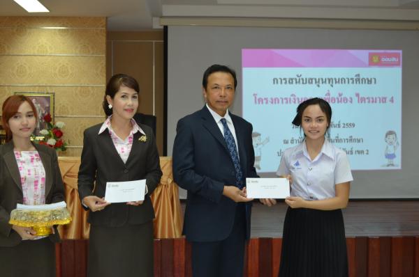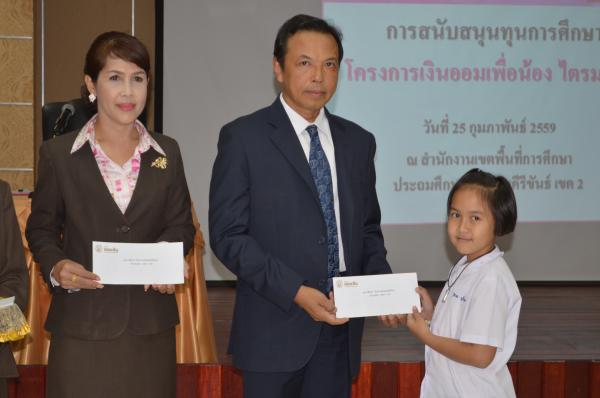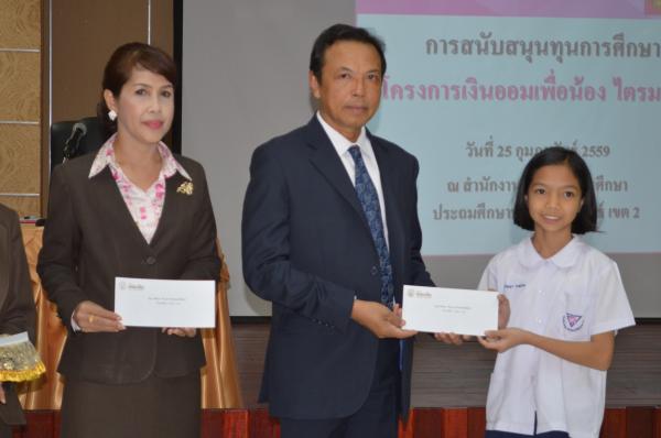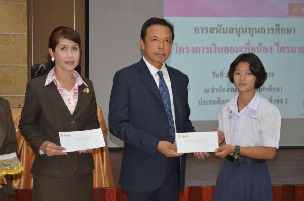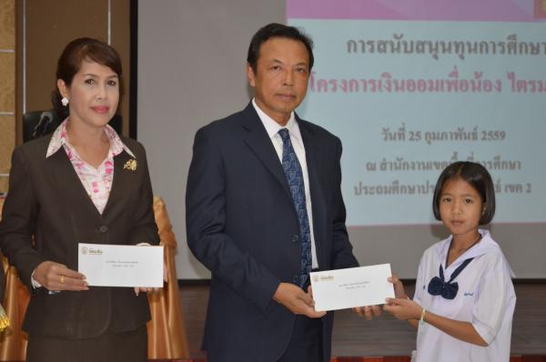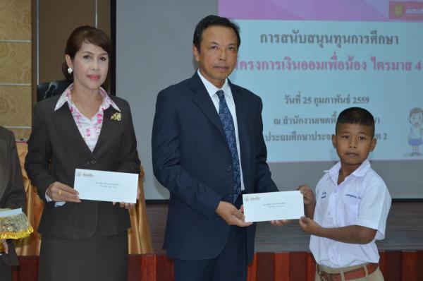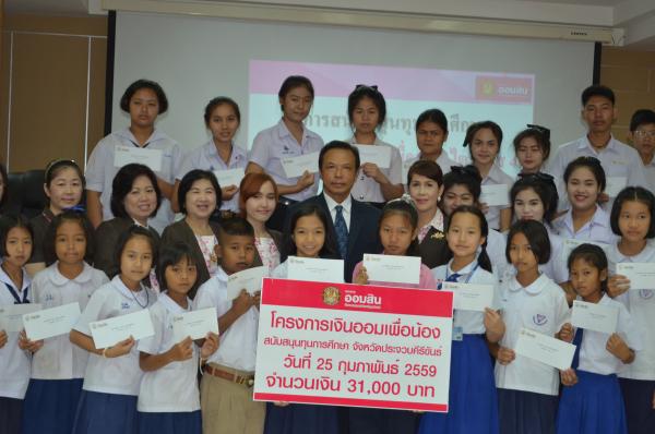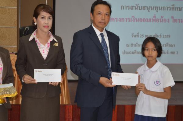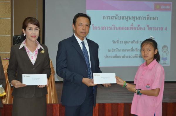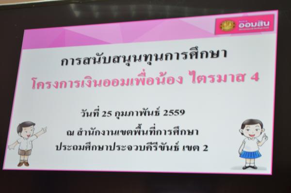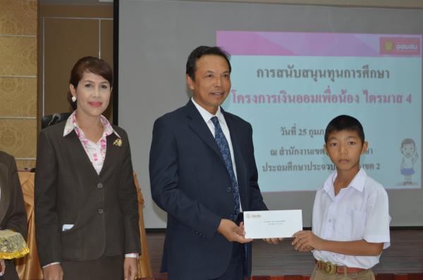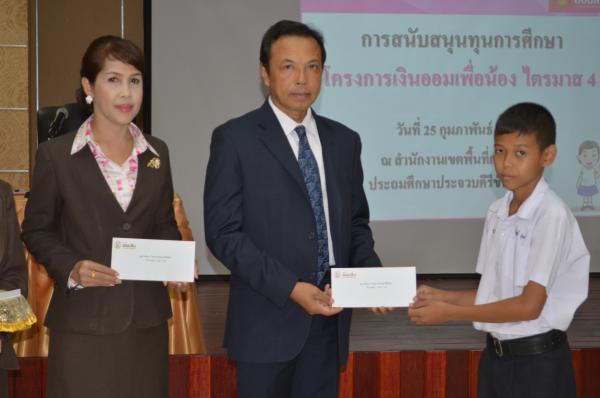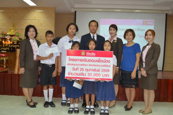 เมื่อวันที่ 25 กุมภาพันธ์ 2559 นายสุนาจ แก้วสุข ผู้อำนวยการสำนักงานเขตพื้นที่การศึกษาประถมศึกษาประจวบคีรีขันธ์ เขต 2 เป็นประธานมอบทุนการศึกษา จากธนาคารออมสินภาค 4 และธนาคารออมสินเขตประจวบคีรีขันธ์ จำนวน 31 ทุน ให้กับนักเรียนในสังกัด สำนักงานเขตพื้นที่การศึกษาประถมศึกษาประจวบคีรีขันธ์ เขต 2 โดยมีนางสมถวิล เชื้อชาย ผู้ช่วยผู้จัดการธนาคารออมสินสาขาหัวหิน เป็นผู้กล่าวรายงาน “ โครงการเงินออมเพื่อน้อง” ธนาคารออมสินภาค 4และธนาคารออมสินเขตประจวบคีรีขันธ์ มีทั้งสิน 11 สาขา ได้จัดทำโครงการนี้เพื่อเป็นการส่งเสริมและสนับสนุนโอกาสทางการศึกษา ให้กับนักเรียน นิสิต และนักศึกษา โดยธนาคารออมสินนำรายได้ส่วนหนึ่งจากจำนวนบัตรเดบิตทุกประเภทที่ลูกค้าสมัครใช้บริการตั้งแต่วันที่ 1 มกราคม 2558 ถึงวันที่ 30 พฤศจิกายน 2558 มาเป็นเงินสนับสนุนในรูปแบบทุนการศึกษาให้เปล่า และไม่มีภาระผูกพันกับธนาคาร โดยมีนักเรียนในสังกัด สพป.ปข. 2 เข้าร่วมรับทุนการศึกษา ณ ห้องประชุมสามพระยา ชั้น 3 สพป.ปข. 2