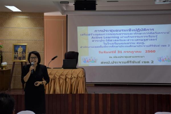 นางสริษา แสงอุทัย รอง ผอ.สพป.ปข.2 เป็นประธานเปิดการอบรมเชิงปฏิบัติการเสริมสร้างอุดมการณ์คุณธรรมและทักษะการคิดวิเคราะห์ (Active Learning) ผ่านกิจกรรมการเรียนรู้สาระประวัติศาสตร์และสาระเศรษฐศาสตร์ในโรงเรียนคุณธรรม สพฐ. ในวันที่ 31 กรกฎาคม 2560 ณ ห้องประชุมสามพระยา ชั้น 3 สำนักงานเขตพื้นที่การศึกษาประถมศึกษาประจวบคีรีขันธ์ เขต 2