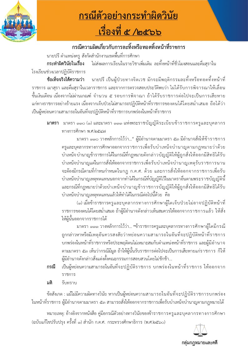 กรณีตัวอย่างการกระทำผิดวินัย 5/2566 ความผิดเกี่ยวกับการละทิ้งหรือทอดทิ้งหน้าที่ราชการ